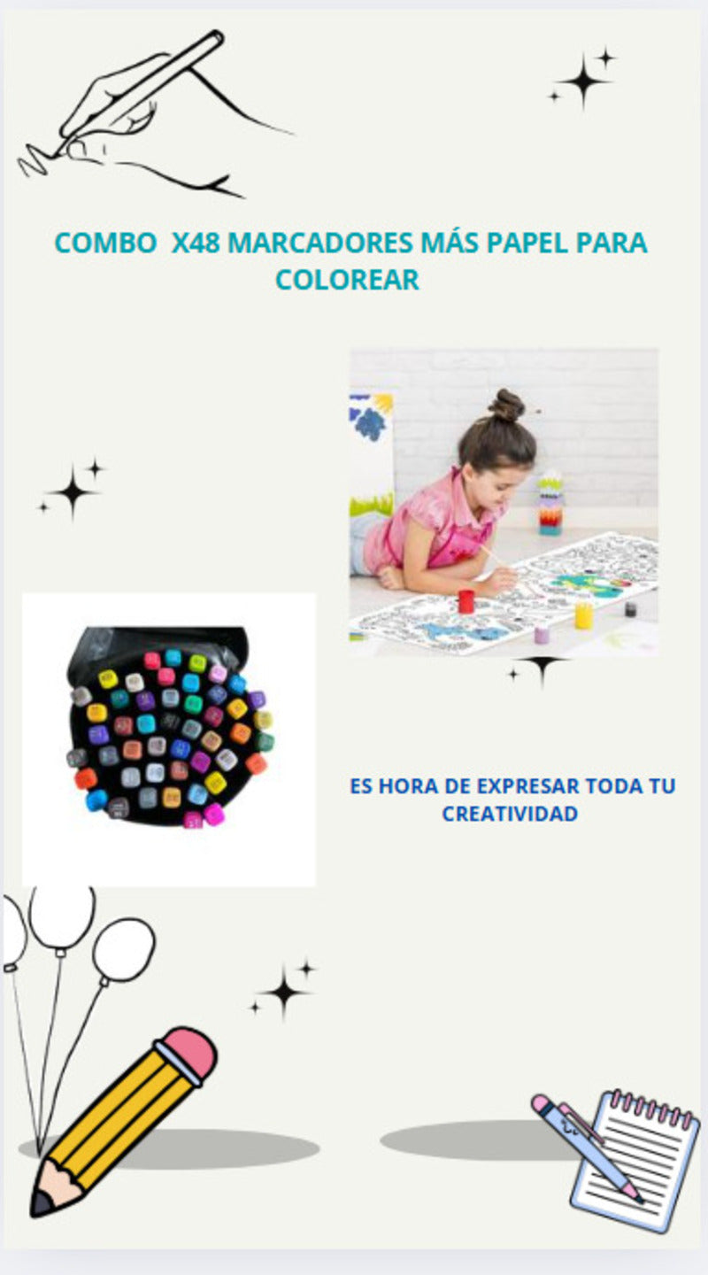 COMBO 48 MARCADORES MAS PAPEL 3 M Papel De Colorear Para NiñosHecho de papel de alta calidad, es seguro, lo suficiente como para pintar y mejorar tu mano. La superficie fina y lisa proporciona excelentes recursos para obras de diseño y arte. Durante este período, disfrutará de mucha diversión y relajación. Puede que quieras experimentar este maravilloso proceso con tu familia y amigos. Tamaño: 300 x 30. PRODUCTO GENÉRICO Importante tener presente que no aplica garantía por Color o Modelo ya que se envía según disponibilidad y este producto no cuenta con variables. MARCADORES DOBLE PUNTA X48Puntas dobles: anchas y delicadas, adecuadas para resaltar y subrayar con precisión. El pincel de 1mm/6mm le permite escribir con líneas finas y gruesas, proporcionando una excelente versatilidad y flexibilidad, lo que le permite crear fácilmente varios estilos, bocetos y patronesUsos infinitos: al usar estos súper rotuladores de doble punta, su imaginación se vuelve vívida, porque son muy adecuados para dibujar, escribir, dibujar, pintar, pintar, garabatear, llenar libros para colorear para adultos o cualquier otra cosa que te permita mostrar tu creatividad.Especificaciones a todo color: Estos bolígrafos cubren un amplio espectro y se pueden mezclar para hacer sus propios colores únicos, multiusos y diferentes etiquetas para ayudarlo a almacenar, organizar, rastrear, y compartir regalos o productos diarios.Peso: 524 Gr16 cm x 16cm x 10cmPRODUCTO GENÉRICO Garantías Condiciones de GARANTÍAS. Importante tener presente que no aplica garantía por Color o Modelo ya que se envía según disponibilidad y este producto no cuenta con variables. No aplica Garantía por modelo o color en los productos que no cuentan con variable, se envían según disponibilidad, de igual manera no aplica garantía por intensidad de colores publicados en la imagen. No aplica garantía sobre garantía.* OJO en el caso de ser aprobada una garantía no se enviará el cambio hasta no recibir el producto sobre el cual se está aprobando la garantía, una vez recibido en un término de 24 a 48 horas se hace despacho del cambio*Condiciones para montar una Garantía en la plataforma. Toda garantía para ser procesada debe llevar la suficiente información con videos o fotos donde se pueda evidenciar el daño o mal funcionamiento de las mismas. Y debe llevar la guía de entrega con la que llego. (la guía hace las veces de facturación para la reclamación de la orden)Condiciones para la devolución de un producto. * Para hacer efectiva la devolución, el producto debe entregarse debidamente protegido cuidando el estado del empaque original, incluir todos los documentos y/o manuales y accesorios (si aplica). Además, el estado de la guía debe encontrarse en ENTREGADO, para así mismo proceder.Garantías por piezas Faltantes * Piezas faltantes o productos rotos, dañados y con abollonaduras: Para realizar un proceso de garantía, cuentas con máximo 2 días para reportarla a partir de la recepción del producto, a través de la plataforma, en la cual se debe especificar y argumentar la novedad con evidencias (fotos y videos del estado de recibido del producto con su empaque y la foto o video de la guía de recibido)Ley de retracto* Ley 1480 de 2011/ Para ejercer el derecho de retracto, el consumidor debe devolver el producto al proveedor en las mismas condiciones en que lo recibió. Los costos de transporte y otros que conlleve la devolución corren por cuenta del consumidor. El término máximo para ejercer el derecho de retracto será de cinco (5) días hábiles, contados a partir de la entrega del producto. Se anulará automáticamente el derecho a retracto si el producto fue usado. o no viene en las mismas condiciones de entrega, con sus accesorios, sellos de seguridad, manuales y lo que conlleve el mismo. Fallas de fábrica* Para realizar el reporte, cuentas con 30 días de garantía por funcionamiento y/o daños del producto que no estén relacionados con el correcto funcionamiento de este, es importante aportar las evidencias (video) donde el producto no este funcionando y se debe reportar mediante la plataforma. En casos de Cambios o devolución de las garantías. * En los casos que se apruebe una garantía por mal funcionamiento o cambio del producto. Se deberá enviar el producto inicial a nuestras bodegas. Una vez el producto llegue contaremos con 48 horas para el envió del producto por cambio o reparación de este.Si encuentras un mejor precio en el mercado, escríbenos y compártenos el link de este para poderlo evaluar.